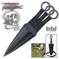 Just like the throwers that Lee Christmas uses in The Expendables movie this set of three throwers is perfectly balanced and amazingly accurate! This throwing knife set features three perfectly balanced throwing knives constructed of single pieces of anodized AUS-6 stainless steel. Each thrower measures 12 inch long and features an anodized double-edged stainless steel blade with a black cord-wrapped handle with a finger hole. Included is a custom nylon sheath with boot loop and leg strap for multiple carrying options. United Cutlery the industry leader in fine licensed film replicas and collectibles has created a one of a kind masterpiece using top quality craftsmanship. For more than 20 years United has been the industry leader in producing top quality collectibles. United Cutlery UC2772