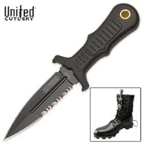 United Combat Sub Commander Mini Boot Knife Black The ultimate in concealedpat self-defense; these Sub Commander mini boot knives hide discreetly within reach at all times. An injection-molded sheath with nylon lanyard ensures they are close at hand in case of attack. An impact resistant TPR handle is strong and textured for a slip-proof gripplete with a brass lanyard hole. Razor-sharp AUS-6 stainless steel blades are double edged with aplete blood-groove for an extreme cut whtn stabbed and slashed. The extended TPR guard ensures no accidental injuries to your hand while in use. 5" ov 2 1/2" bl